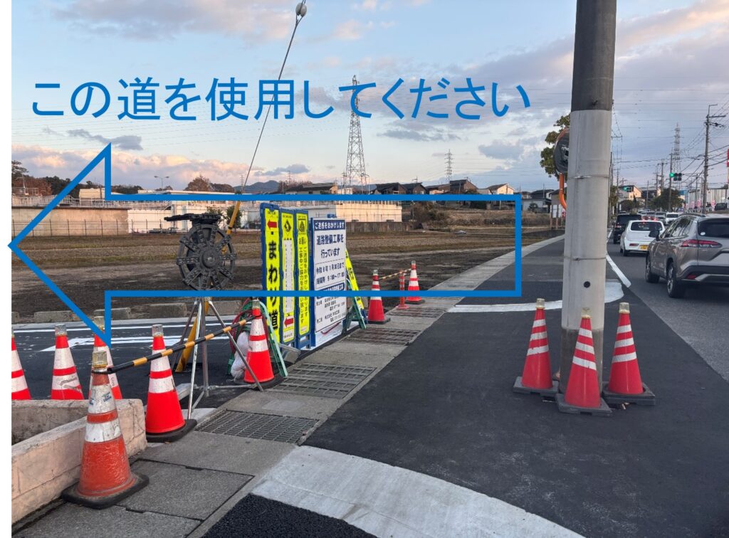 工事期間中は一本隣(ファミリーマートさん側)の拡張された道路からお回りください。
